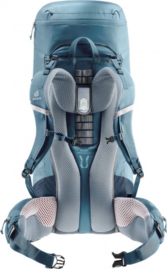 Nazwę temu systemowi dała specjalna pianka wypełniająca system - Aircontact. Pianka posiada otwarte komory. Przy nacisku ciała na piankę, wilgoć i gorące powietrze zostają odpompowane na zewnątrz systemu. Taka konstrukcja systemu nośnego daje doskonały komfort podczas noszenia plecaka, przy równoczesnej stabilizacji ładunku na plecach. Właściwości systemu Aircontact zostały potwierdzone testami, które dowiodły, że plecaki z użyciem tej pianki redukują potliwość o około 15 procent. Pianka wypełniająca część styku systemu nośnego z plecami, zbudowana z oddychających komór, idealnie odprowadzających gorące powietrze wytwarzane przez ciało. Efekt pompowania - następujący wskutek nacisku na piankę podczas ruchu powoduje cyrkulację powietrza, zasysane z zewnątrz przenika do struktury pianki wypierając jednocześnie nagrzane powietrze. Anatomicznie uformowane, aluminiowe szyny, ułożone w kształcie litery X, dodatkowo wzmocnione odpowiednim poprzecznym profilem zapewniają stabilność całego systemu. Sposób ułożenia szyn, pozwala na lepsze dopasowanie systemu nośnego do pleców, lepszy balans ciężaru i przeniesienie go na pas biodrowy. W pasie biodrowym zastosowano system Vari-Quick, to bardzo proste i funkcjonalne dopasowanie położenia pasów nośnych do długości pleców. Dodatkowe troki stabilizujące przy pasach nośnych umożliwiające precyzyjne dopasowanie i wypozycjonowanie plecaka. Od modelu Aircontact 50+10 SL troki można zawiesić na dwóch wysokościach - w zależności od wysokości umieszczenia pasów nośnych. Wysoki komfort noszenia gwarantuje od strony wewnętrznej miękka pianka pokryta oddychającą tkaniną 3D Air - Mesh. W środkowej i zewnętrznej warstwie pasa biodrowego, użyto twardej pianki wzmocnionej dodatkowo PU, której zadaniem jest utrzymanie właściwego anatomicznego kształtu. Solidny i właściwie uformowany pas biodrowy pozwala odciążyć ramiona i dłużej cieszyć się wędrówką.