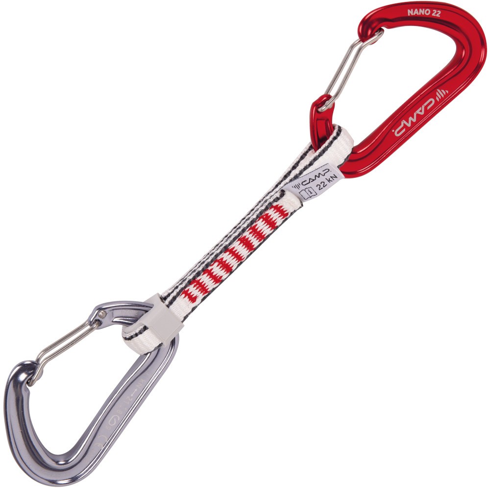 Camp Nano KS 12cm to bardzo lekkie ekspresy wspinaczkowe. Karabinki, z których składa się ekspres Camp Nano, są lekkie jednocześnie posiadają wysoką wytrzymałość. Karabinki wyposażone zostały w druciany zamek o dynamicznej sprężynie. Wpięcie liny do ekspresa jest więc łatwe i przyjemne. Dwa kompaktowe i lekkie karabinki druciane Camp Nano Wire połączone tasiemką Dyneema o szerokości 12mm tworzą doskonałe akcesorium do wspinaczki. Ekspres Camp Nano KS Wire pozostaje niezastąpionym kompanem do codziennego wspinania dzięki dużej trwałości i łagodnej pracy zamka. Taśmy ciasno zaszyto i wyposażono w zabezpieczającą gumkę, dzięki takiemu rozwiązaniu dolne karabinki, do których wpinamy się liną pozostają w poprawnym ustawieniu podczas wspinaczki.