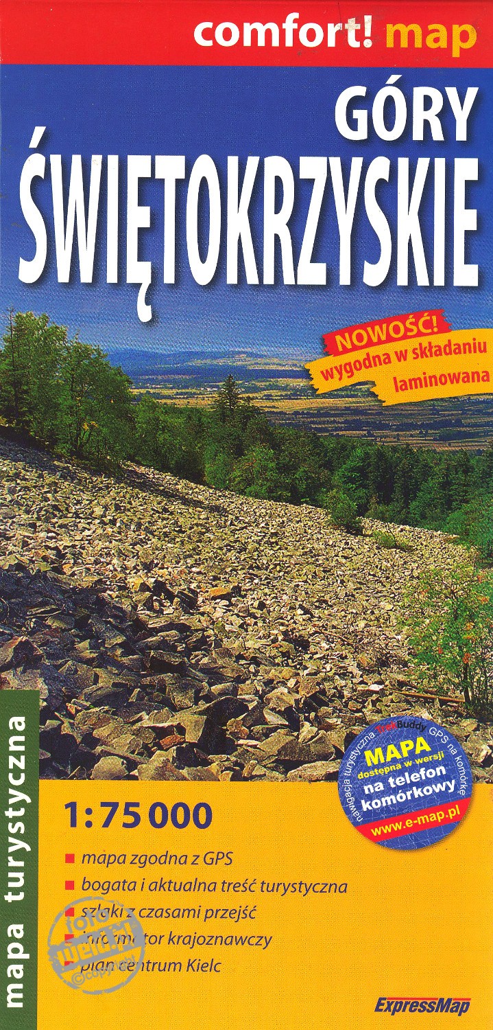 Dwustronnie laminowana, wygodna w składaniu mapa turystyczna Gór Świętokrzyskich i okolicznych parków krajobrazowych, wraz z mapką Kielc i informatorem turystycznym. Mapa opracowana we współpracy z doświadczonymi krajoznawcami z regionu dogodna zarówno dla pieszego, jak i rowerzysty, skala 1:50 000 (1 cm – 500 m) bogata treść turystyczna, m.in.: szlaki piesze i rowerowe, ścieżki dydaktyczne i spacerowe, trasy konne, odległości na szlakach, muzea, zabytki i inne interesujące obiekty, parki narodowe, rezerwaty przyrody, atrakcje przyrodnicze. Poziomice pokazujące ukształtowanie terenu mapa zgodna z GPS – współrzędne geograficzne w układzie WGS-84.