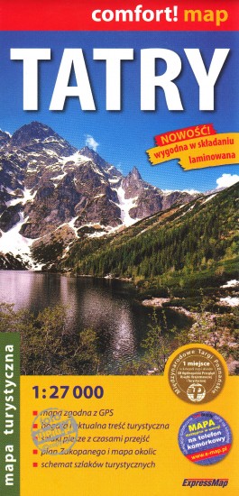 Dwustronnie laminowana, łatwa w składaniu i trwała mapa turystyczna Tatr w skali 1:27 000. Swoim zasięgiem obejmuje tereny od Poronina na północy po Przełęcz Waga na południu, od Ostrego Rohacza na zachodzie po Głodówkę na wschodzie. Mapa posiada bogatą treść przydatną zarówno dla turystów pieszych, rowerowych jak i narciarzy - szlaki piesze wraz z podanymi czasami przejść, niebezpieczne odcinki szlaków, oznaczenia zagrożenia lawinowego, trasy rowerowe, wyciągi narciarskie oraz narciarskie trasy zjazdowe i biegowe. Zaznaczono szczegółowo rozróżnioną bazę noclegową - schroniska górskie i młodzieżowe, hotele, kempingi oraz pola namiotowe. Dzięki cieniowaniu uzyskano plastyczny obraz rzeźby terenu. Dokładność i aktualność zapewnia mapie szczegółowa weryfikacja w terenie. Dodatkowo zamieszczono mapę szlaków turystycznych w skali 1:81 000, szczegółowy plan Zakopanego w skali 1:15 000 oraz mapę okolic Zakopanego w skali 1:160. Mapa jest zgodna z GPS - posiada współrzędne geograficzne w układzie WGS-84.