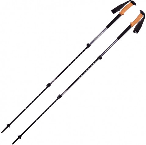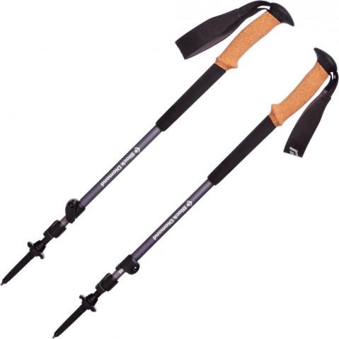 Black Diamond Trail Cork to profesjonalne kije trekkingowe przedłużonym uchwytem. Kije Trail Cork zostały wyposażone w korkowe uchwyty zapewniające bardzo dobrą przyczepność i odprowadzenie wilgoci. Przedłużony grip z pianki EVA umożliwia wykorzystanie kijów w trudnym terenie bez dodatkowej regulacji. Prostej regulacji długości dokonuje się za pomocą zaciskowych klamer Flicklock, które są o wiele pewniejsze od klasycznych systemów rozporowych. Kije posiadają końcówki z węglika spiekanego, które można zdemontować i zamienić nowymi w wypadku ich zużycia, letnie i zimowe talerzyki oraz przedłużone rękojeści z tworzywa z samozaciskowymi, łatwymi w regulacji taśmami.