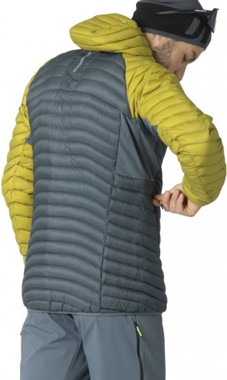 Kurtka puchowa Dynafit Radical Down RDS Hooded Jacket stanie się najlepszym przyjacielem podczas zimowych wycieczek skitourowych ale również w mieście podczas chłodnych dni. Kurtka Radical została wyposażona w ocieplenie z impregnowanego, gęsiego puchu, który zapewni bardzo dobrą izolację termiczną. Dodatkową zaletą tego materiału jest jego wysoka hydrofobowość. W warunkach niekorzystnych dla puchu, kiedy wilgotność jest bardzo wysoka, impregnowany puch Downtek nie będzie tracił swoich parametrów grzewczych, nie straci sprężystości i będzie odprowadzał na zewnątrz kurtki nadmiar wilgoci. Zastosowany w kurtce puch spełnia standard RDS -  dotyczący sposobu pozyskiwania produktu pochodzenia zwierzęcego. Standard RDS został opracowany przy współpracy producentów, sprzedawców oraz grup, działających na rzecz ochrony zwierząt. Przyznanie standardu RDS oznacza spełnienie norm na każdym etapie pochodzenia produktu. Puch znajdujący się wewnątrz kurtki Dynafit Radical Down pochodzi od gęsi, które przez cały okres hodowli miały zapewnione odpowiednie warunki życiowe. Ptaki podczas hodowli nie były przymusowo karmione, nie cierpiały z powodu strachu i bólu. Wytrzymały materiał zewnętrzny Dynastretch ochroni użytkownika kurtki przed opadem śniegu i niewielką mżawką. Jego delikatnie rozciągliwa struktura pozwoli na lepsze dopasowanie do kształtów anatomicznych. Kurtka puchowa Dynafit Radical Down RDS Hooded Jacket to również świetny ocieplacz pod membranę. Dzięki zastosowaniu impregnowanego puchu nie będzie tracił swoich właściwości np. pod kurtką trekkingową z Gore-tex.