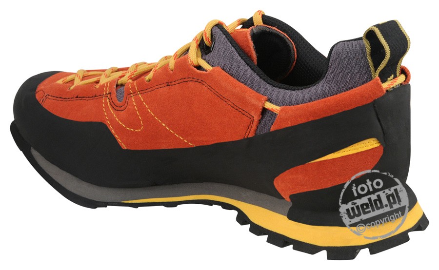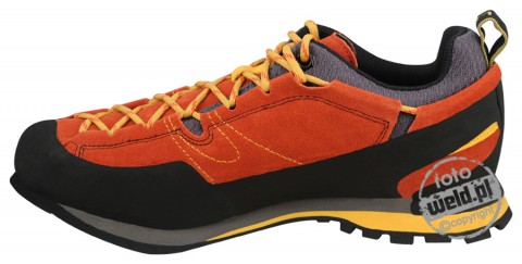 Buty podejściowe Boulder X to od kilkunastu lat klasyk w kolekcji La Sportiva. Buty podejściowe La sportiva Boulder to nie tylko świetne buty podejściowe ale również idealne buty na teren typu via ferrata. Podeszwa Vibram Impact Brake zapewnia doskonałą przyczepność na skale i pełną amortyzację stopy podczas marszu. Asymetryczny, oplatający stopę system wiązania sznurowadeł to doskonałe dopasowanie do stopy i pełna kontrola. Amortyzacja podeszwy została wykonana z materiału Eva, który chroni stopy użytkownika przed przemęczeniem. Wnętrze cholewki wyłożono materiałem typu mesh, który odprowadza wilgoć, jest przyjemny w dotyku i trwały. Oblanie przodu i boku ochroni buty podejściowe La Sportiva Boulder X przed niekorzystnym działaniem twardej skały w trudnym terenie podejściowym. Niskie buty górskie La Sportiva Boulder X, sprawdza się nie tylko w górach, jest to także świetny model dla osób, które w miejskiej dżungli preferują górski styl.