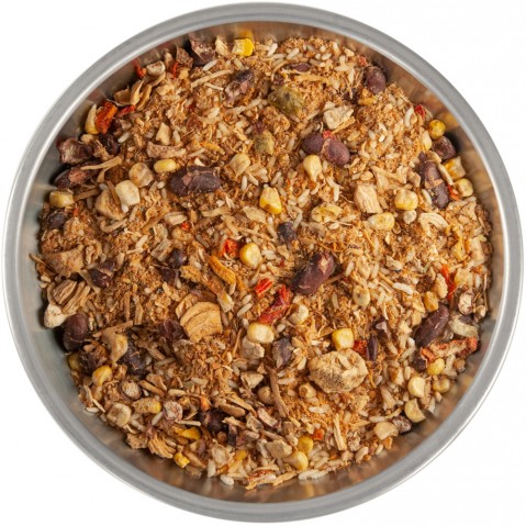 filet z piersi kurczaka (kostka) 38%, ryż 27%, fasola czerwona 11%, papryka czerwona 5%, kukurydza, mąka pszenna, cebula, koncentrat pomidorowy, przyprawy (zawiera seler), olej rzepakowy, sól, cukier