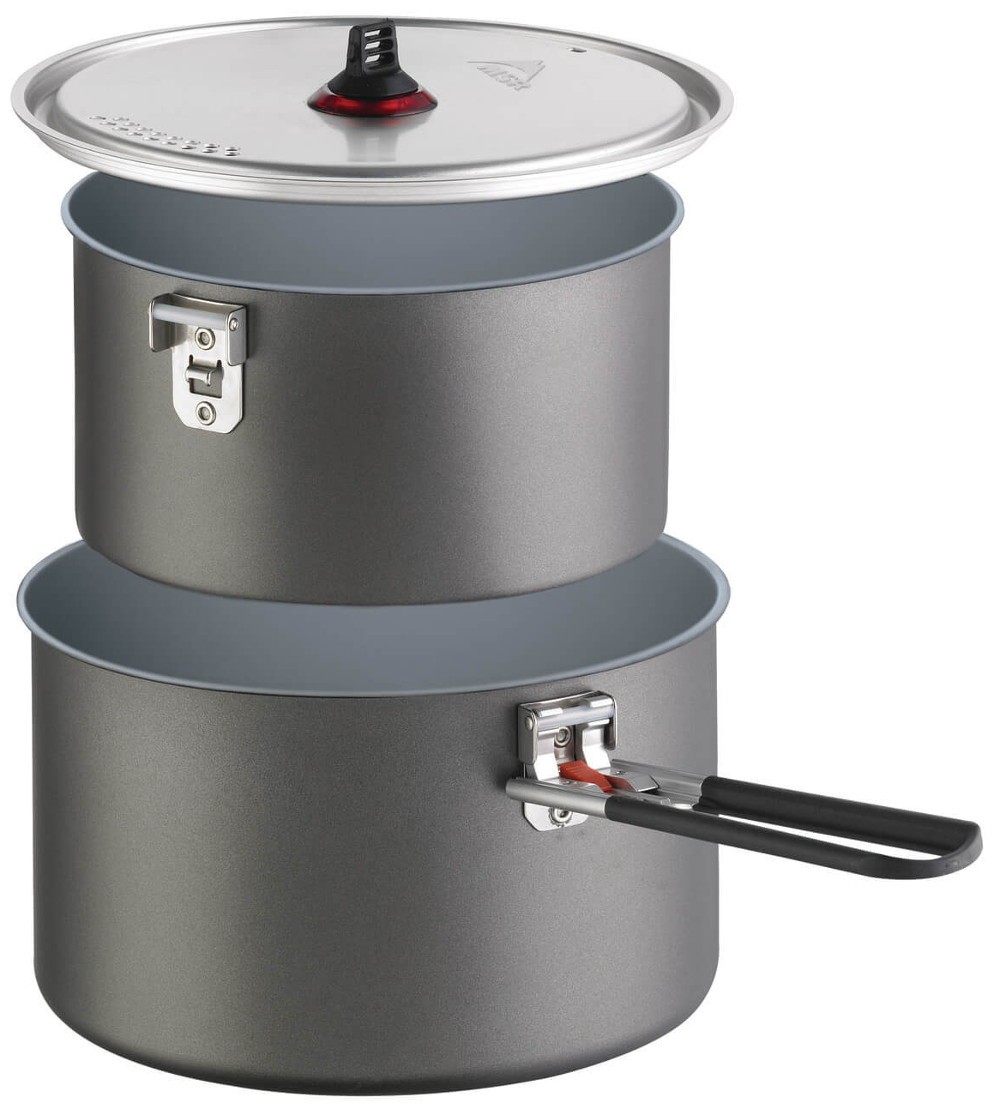 Zestaw naczyń MSR Ceramic 2 Pot Set to idealny zestaw naczyń dla dwóch osób, wykonany z anodyzowanego aluminium powleczonego warstwą ceramiczną. Warstwa ceramiczna jest odporna na zadrapania, potrawy nie przywierają do garnka, łatwo go umyć nawet w warunkach terenowych. W komplecie garnek 1,5 litra, garnek 2.5 litra, odczepiana, uniwersalna rączka i pokrywka z izolującym uchwytem. Zestaw kompatybilny z innymi naczyniami MSR. Naczynia turystyczne MSR Ceramic 2 Pot Set to wysokiej jakości zestaw naczyń przeznaczony dla turystów, którzy cenią sobie wygodę gotowania na wyprawach, a jednocześnie chcą zachować lekkość i trwałość sprzętu. Zestaw składa się z dwóch garnków, które są idealnym rozwiązaniem do gotowania w plenerze. Dzięki ceramicznej powłoce, naczynia te łączą wydajność, łatwość czyszczenia oraz wytrzymałość, oferując doskonałe doświadczenie kulinarne podczas biwaków, trekkingów czy innych podróży. Główną cechą wyróżniającą naczynia MSR Ceramic 2 Pot Set jest specjalna ceramiczna powłoka, która zapobiega przywieraniu jedzenia do dna garnków. Dzięki tej powłoce gotowanie staje się znacznie łatwiejsze, a czyszczenie naczyń po użyciu jest szybsze i bardziej komfortowe. Ceramiczna powłoka jest również bardziej odporna na zarysowania w porównaniu do tradycyjnych powłok teflonowych, co przekłada się na dłuższą trwałość naczyń.