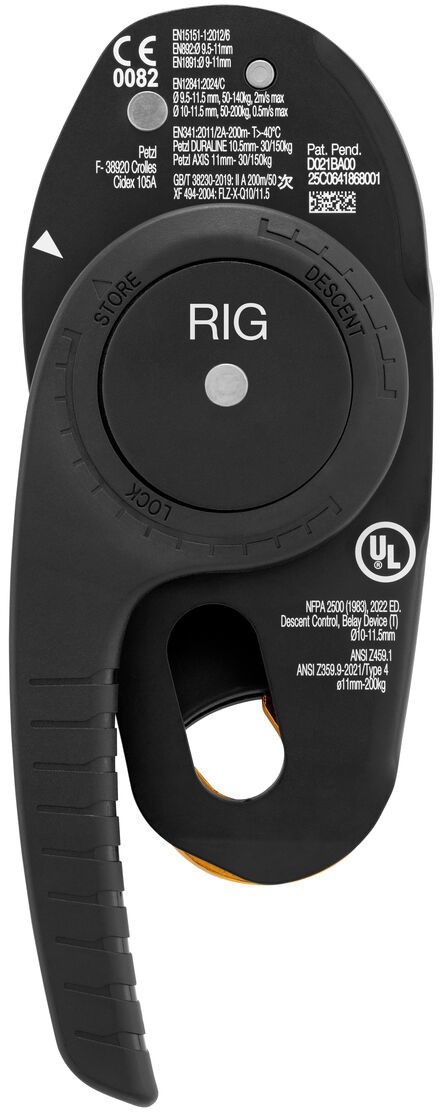 Petzl RIG to przyrząd zjazdowy z automatyczną blokadą, przeznaczony dla doświadczonych użytkowników, teraz w wersji umozliwiającej wymianę krzywki. Jest wyposażony w ergonomiczną rączkę umożliwiającą wygodną kontrolę zjazdu. System AUTO-LOCK umożliwia łatwe przyjęcie pozycji na stanowisku pracy, bez konieczności manipulacji rączką i robienia blokady z liny. Po zablokowaniu lina może być wybrana, bez konieczności manipulacji rączką. Zapadka zabezpieczająca na okładce ruchomej umożliwia wpięcie w linę bez konieczności wypinania z uprzęży, co ułatwia przepinanie się. Wzmocnienie ze stali nierdzewnej w strefie tarcia liny zwiększa odporność przyrządu na zużycie. Przeznaczony do prac na linie, dla doświadczonych użytkowników.
