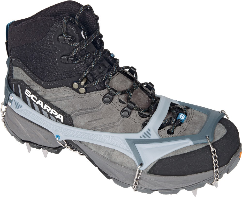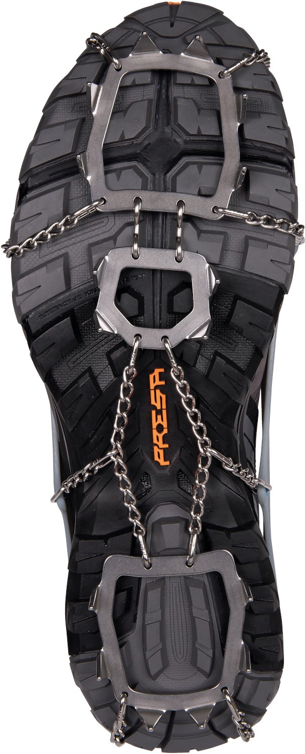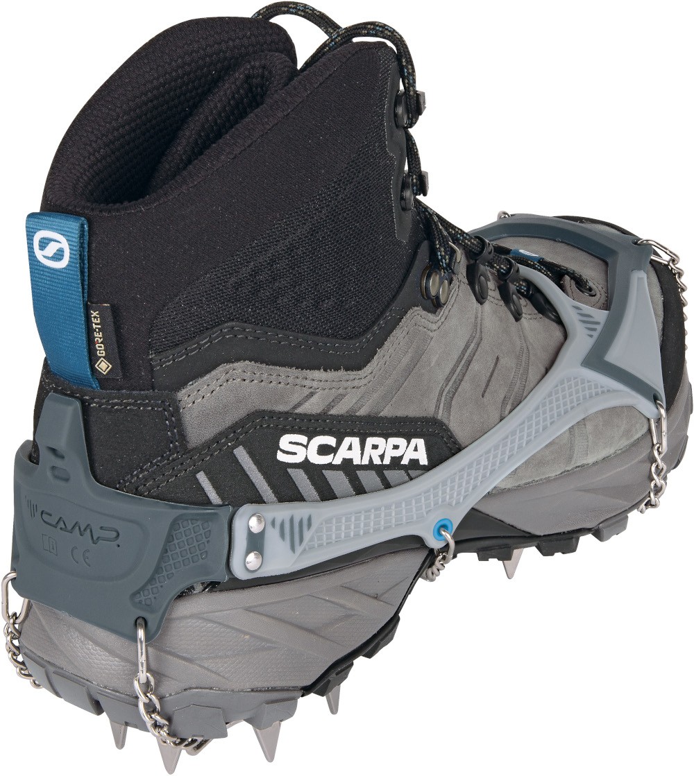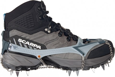 Ice Master Pro to najbardziej dopracowane raczki w ofercie Camp. Producent połączył nowy, dwumateriałowy system mocowania z bardziej sztywną konstrukcją kolców, minimalizując ilość metalu tam, gdzie jest zbędny. Efekt? Niska waga, stabilne osadzenie na bucie i przyczepność, która naprawdę robi różnicę na oblodzonych podejściach. Dzięki precyzyjnie rozmieszczonym 16 kolcom ze stali nierdzewnej Ice Master Pro świetnie trzymają w trawersach, dobrze hamują na stromszych fragmentach i zapewniają większą stabilność boczną. Front jest podwójnie przegubowy, więc raczki lepiej pracują razem z butem na nierównym, zmiennym podłożu. Dwumateriałowy koszyk 3D jest miękki tam, gdzie potrzebuje elastyczności, i sztywny tam, gdzie odpowiada za trzymanie, dzięki temu stabilność na bucie jest naprawdę mocna. W zestawie znajduje się kompaktowe, wentylowane etui, praktyczne, trwałe i zaprojektowane tak, by nie poniszczyć reszty sprzętu w plecaku.