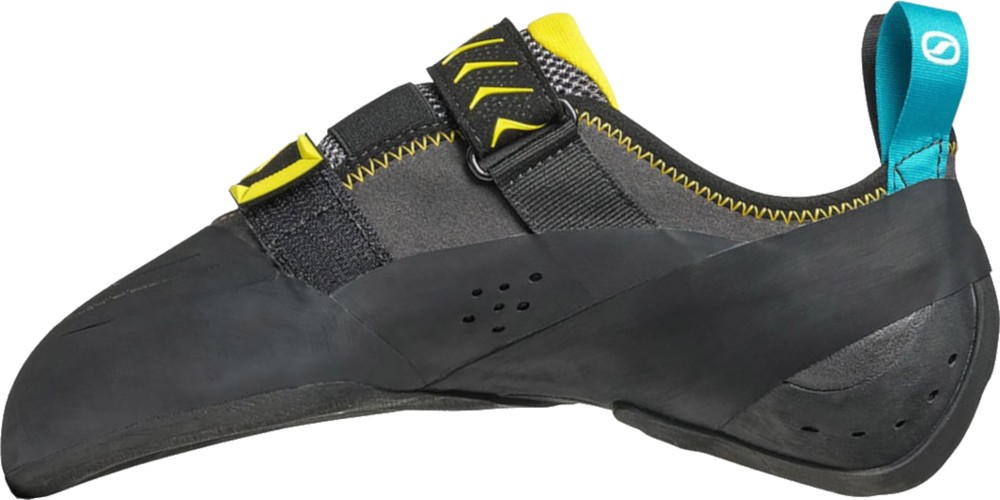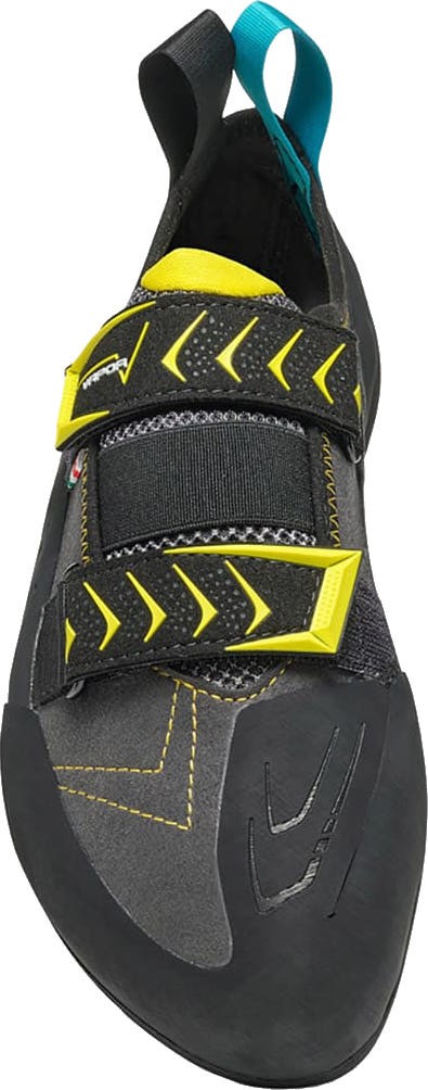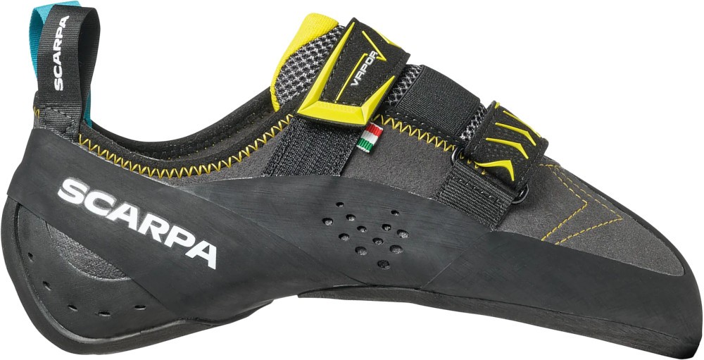 Scarpa Vapor V to lekko asymetryczne buty wspinaczkowe na rzepy. Scarpa Vapor V to uznany na rynku model buta wspinaczkowego o dużej sztywności i wysokiej wszechstronności dedykowany na trudne i techniczne wspinanie. Vapor V jest odpowiedzią marki Scarpa na kultowego buta wspinaczkowego La sportiva Miura VS. Podobnie jak Miura, Vapor V charakteryzuje się umiarkowaną asymetrycznością, dzięki czemu sprawdza się na długich i pionowych drogach z liną. Podeszwa wykonana z Vibramu XS Edge o grubości 3.5mm to doskonałe tarcie i trzymanie w niemalże każdym typie skały. Buty wspinaczkowe Scarpa Vapor V posiadają agresywny czubek, umożliwiający precyzyjne stawanie zarówno w wyjeżdżających obłych dziurkach jak i na małych krawądkach. Przeciwstawne taśmy Velcro z dodatkowym, elastycznym ściągaczem odpowiadają za świetne dopasowanie. Buty wspinaczkowe Scarpa Vapor V są wykonane z miękkiego i przyjemnego w dotyku zamszu. Celem zwiększenia komfortu użytkowania język otrzymał dodatkową okładzinę z materiału typu mesh. Połączenie świetnych materiałów z perfekcyjnym szyciem pozwoliło uzyskać precyzyjny, wygodny i trwały but wspinaczkowy. Buty wspinaczkowe Scarpa Vapor V zostały zaprojektowane z myślą o średniozaawansowanych oraz zaawansowanych wspinaczach, pragnących pokonywać coraz trudniejsze drogi skalne. Ten wszechstronny model dedykowany jest w szczególności do wspinaczki z liną, zarówno w skałach jak i na ścianie wspinaczkowej. Jednak dzięki miękkiej i precyzyjnej pięcie oraz oblaniu na czubku, buty Scarpa Vapor V mogą być z powodzeniem wykorzystywane do boulderingu.