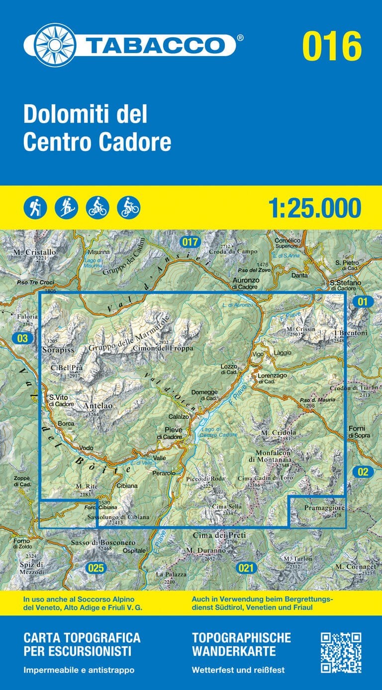 Doskonała mapa w skali 1:25 000. Mapa Tabacco to najlepsza na rynku pozycja opisująca Dolomity rejonu Sorapis, Antalao i Marmarole. Precyzyjnie pokazuje przebieg grani, dolin i lodowców. Wszystkie szlaki, ferraty i podejścia są dokładnie wyrysowane. Zrozumiała i przejrzysta treść oraz doskonały, kredowy papier to sygnatura wszystkich map wydawnictwa Tabacco.