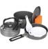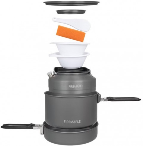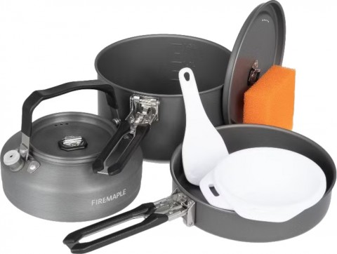Fire Maple Feast 2 to zestaw naczyń turystycznych z garnkiem, patelnią i czajnikiem. Dla dwóch lub trzech osób zestaw naczyń Fire Maple Feast 2 to prawie kuchnia turystyczna de luxe. Z tym kompaktowym zestawem można sobie urządzić naprawdę wygodną kuchnię. Model Fire Maple Feast 2 to spory garnek o pojemności 1,5l, praktyczna patelnia z karbowanym dnem, do którego nie przywierają potrawy, a także czajniczek do błyskawicznego przyrządzania gorącej herbaty albo krzepiącej kawy. Naczynia Fire Maple wykonane są z anodowanego i utwardzanego aluminium. Dzięki niemu są trwałe i łatwo utrzymuje się je w czystości. Każde z naczyń ma składaną rączkę. Garnek i patelnia posiadają rączki z automatyczną blokadą, która zapobiega samoczynnemu złożeniu się rączki. Wszystkie uchwyty, także uszka na pokrywkach wykonane są przy użyciu tworzywa, które izoluje od gorącego metalu. Oprócz podstawowych naczyń w zestawie znajdują się dwie miseczki, łyżka do smażenia i gąbka do czyszczenia zabrudzonych naczyń.