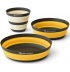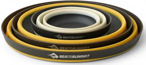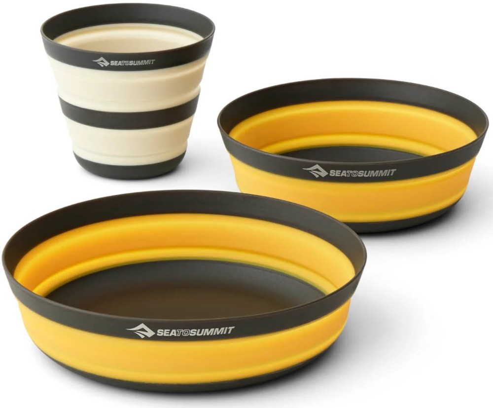 Składany zestaw naczyń Sea to Summit Frontier Ultralight Dinnerware Set 3 to doskonała pomoc w każdym biwaku. Zestaw Sea to Summit Frontier Ultralight Dinnerware Set to lekkie i kompaktowe naczynia turystyczne, zaprojektowane z myślą o minimalistach i osobach ceniących każdy gram w ekwipunku. Wykonane są z wytrzymałego, bezpiecznego dla żywności silikonu i nylonu wzmocnionego włóknem szklanym, dzięki czemu są odporne na uszkodzenia, a przy tym bardzo lekkie. Charakteryzują się niskim profilem i prostą, funkcjonalną konstrukcją, łatwo je zapakować do plecaka, zajmują mało miejsca, a ich powierzchnia jest odporna na zarysowania. Można w nich zarówno jeść posiłki, jak i przygotowywać proste dania. Nadają się też do kontaktu z gorącą żywnością i są przystosowane do mycia w zmywarce. Za swoją funkcjonalność naczynia te były wielokrotnie nagradzane otrzymując tytuły: "Editors Choice 2015" przyznawanego przez Magazyn Backpacker, "Best New Gear 2015" przyznawanego przez Gear Institute oraz "Gear of The Year 2015" przyznawanego przez National Geographic Adventure.