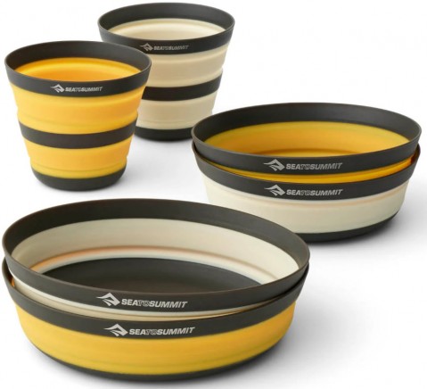 Składany zestaw naczyń Sea to Summit Frontier Ultralight Dinnerware Set 6 to doskonała pomoc w każdym biwaku. Zestaw Sea to Summit Frontier Ultralight Dinnerware Set to lekkie i kompaktowe naczynia turystyczne, zaprojektowane z myślą o minimalistach i osobach ceniących każdy gram w ekwipunku. Wykonane są z wytrzymałego, bezpiecznego dla żywności silikonu i nylonu wzmocnionego włóknem szklanym, dzięki czemu są odporne na uszkodzenia, a przy tym bardzo lekkie. Charakteryzują się niskim profilem i prostą, funkcjonalną konstrukcją, łatwo je zapakować do plecaka, zajmują mało miejsca, a ich powierzchnia jest odporna na zarysowania. Można w nich zarówno jeść posiłki, jak i przygotowywać proste dania. Nadają się też do kontaktu z gorącą żywnością i są przystosowane do mycia w zmywarce. Za swoją funkcjonalność naczynia te były wielokrotnie nagradzane otrzymując tytuły: "Editors Choice 2015" przyznawanego przez Magazyn Backpacker, "Best New Gear 2015" przyznawanego przez Gear Institute oraz "Gear of The Year 2015" przyznawanego przez National Geographic Adventure.